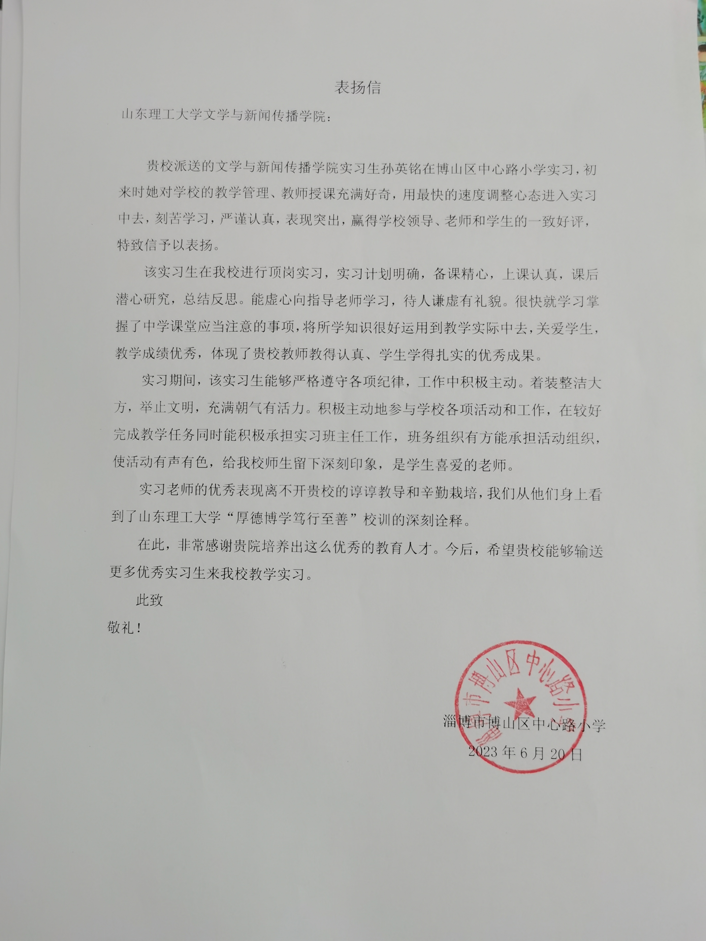 表扬信-文学与新闻传播学院孙英铭