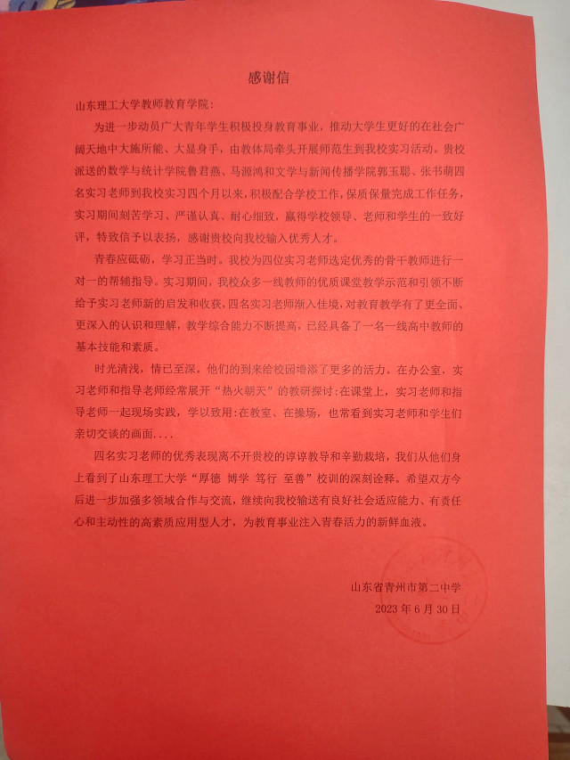 青州市第二中学表扬信-鲁君燕(数学)、马源鸿(数学)、郭玉聪(文学)、张书萌(文学)