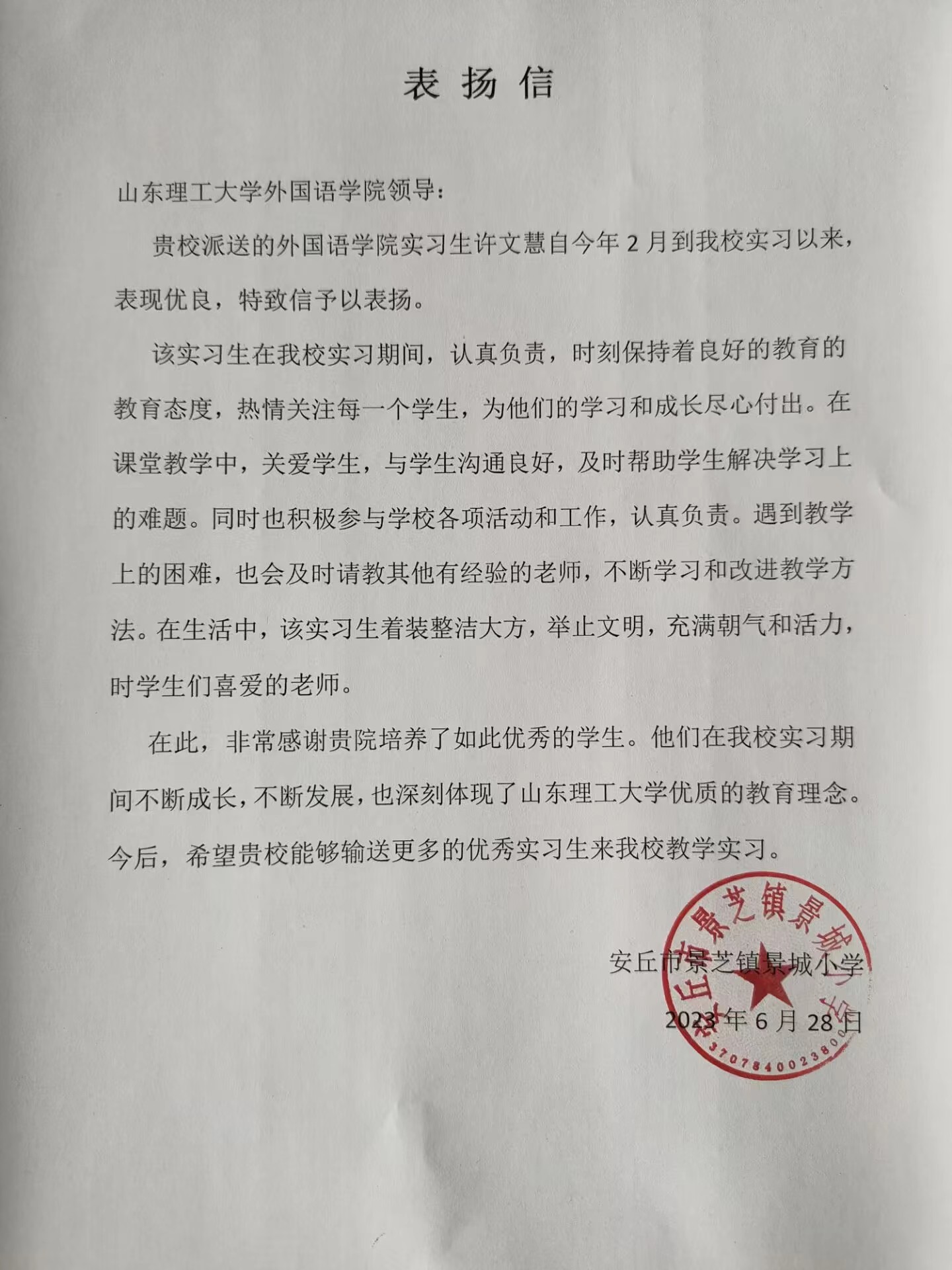 安丘市景芝镇景城小学表扬信-许文慧(英语)