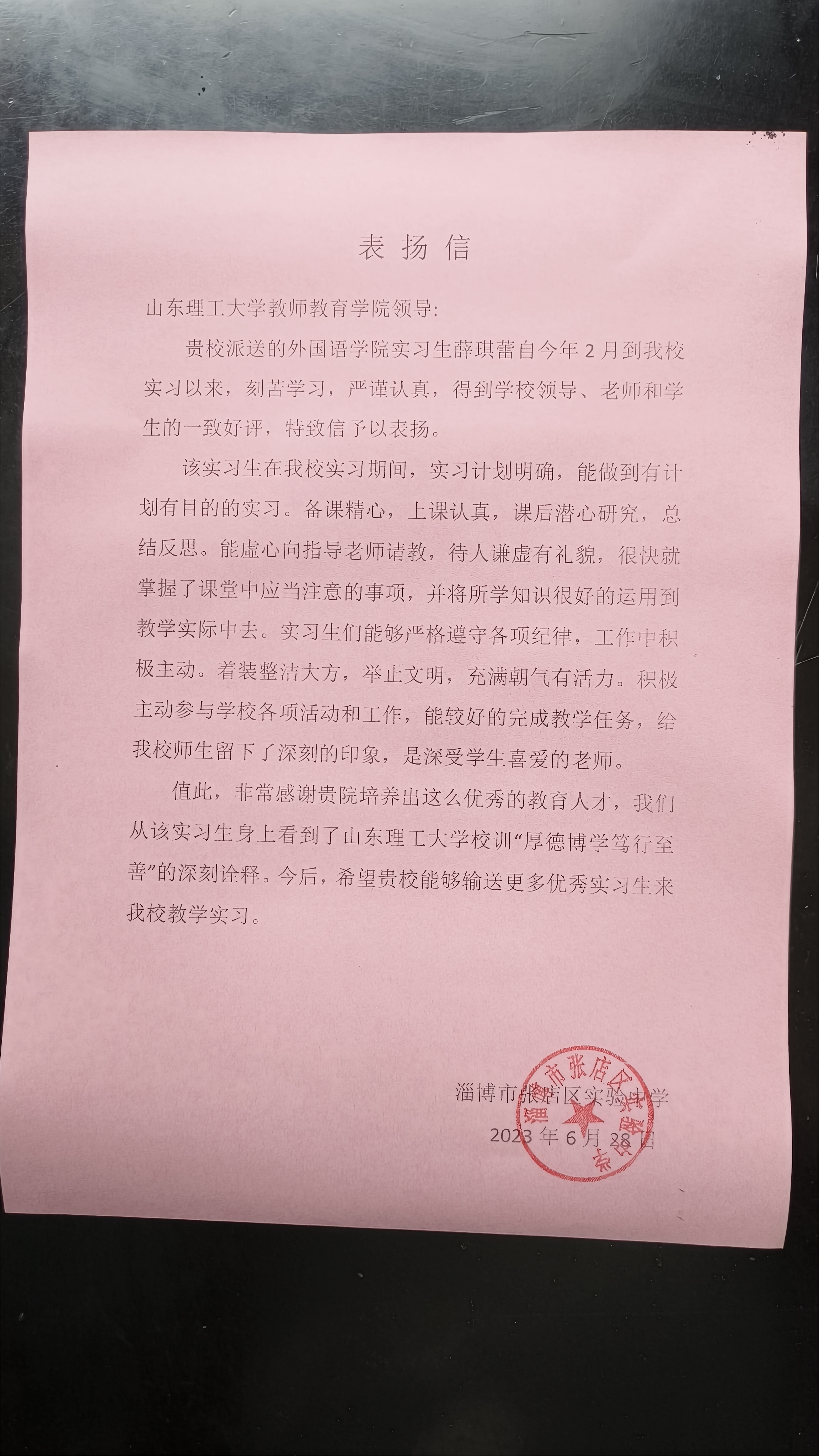 张店区实验中学表扬信-薛琪蕾(英语)