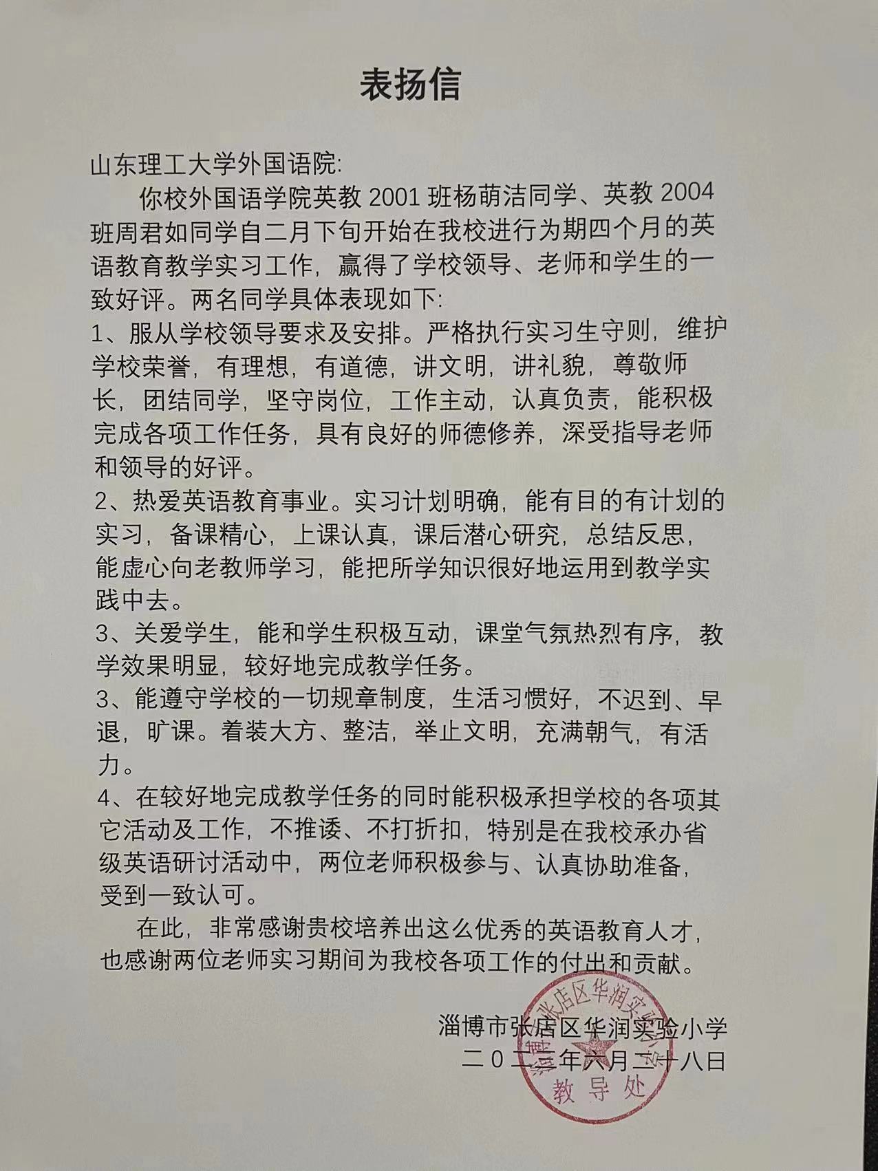 张店区华润实验小学表扬信-杨萌洁、周君如(英语)