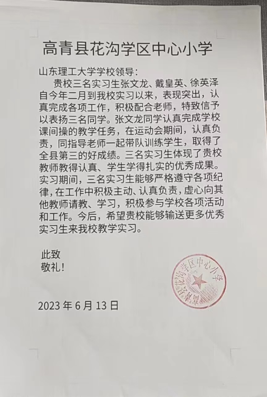 高青县花沟学区中心小学表扬信-张文龙、戴皇英、徐英泽(英语)