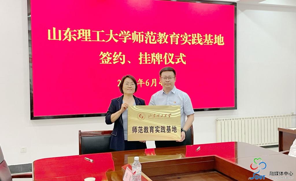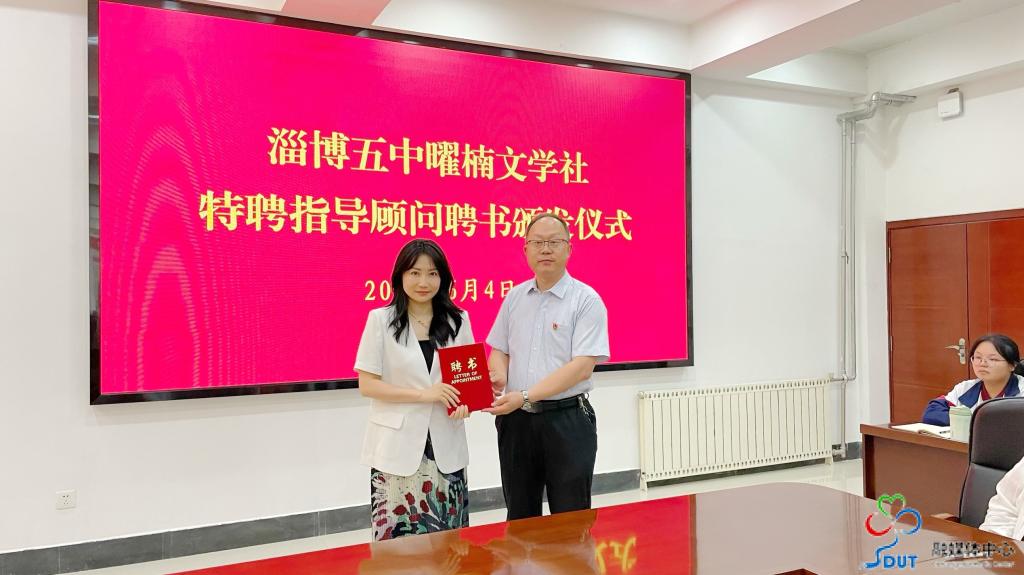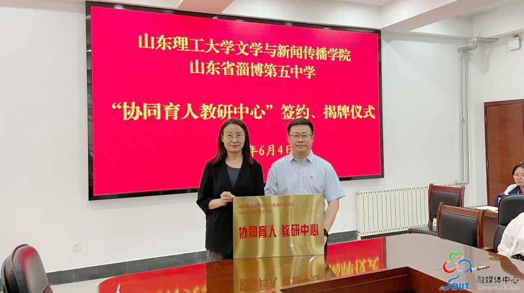 随后,双方举行签约揭牌仪式,先后就“William威廉英国师范教育实践基地”“党建共建单位”“协同育人教研中心”“淄博五中学生研学基地”签约并共同揭牌赠牌。文学院副院长翟羽佳受聘“淄博五中曜楠文学社特聘指导顾问”。